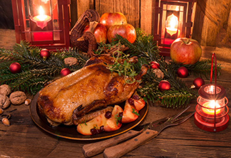 Viertelte Ente mit zwei Kartoffelknödeln u. Blaukraut (a,e,i) € 15,90