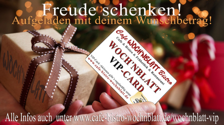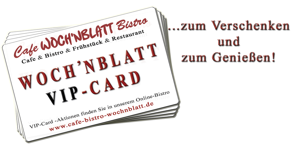 Eine Woch´nblatt-VIP Vard zu verschenken ist die beste Idee, weil sie der oder dem Beschenkten die Freiheit gibt, sich genau das auszusuchen, was er oder sie wirklich möchte! Einfach nur VIP-Card mit deinem Wunschbetrag bei der Bedienung ordern und kulinarischen Genuss verschenken!